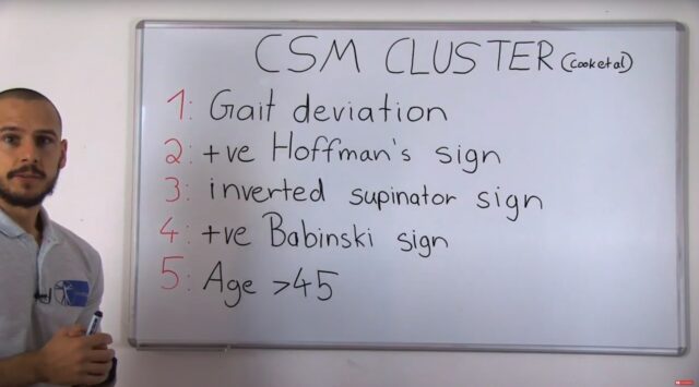 Cook et al. (2010) so izdelali skupek napovednih rezultatov kliničnih testov za vzorec bolnikov z uporabo klinične diagnoze kot referenčnega standarda za CSM. Cilj grozda je odkriti bolezen v začetnih fazah ali izključiti bolezen med presejalnim pregledom.