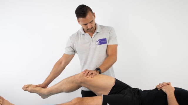 Bolnikovo koleno je upognjeno za 90°. Z desno roko dvignite bolnikovo nogo tako, da jo primete za stransko stran gležnja in izvedete notranjo rotacijo.