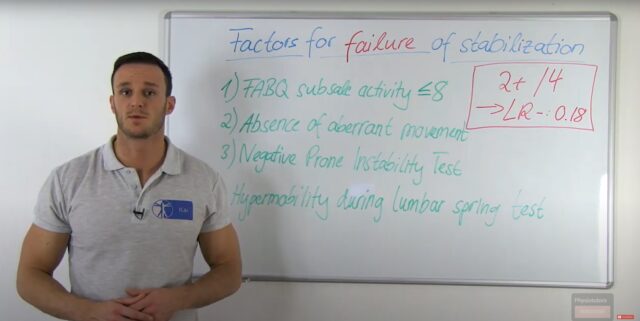 Če želite pri svojem bolniku izključiti program stabilizacijske vadbe, lahko hkrati uporabite naslednje pravilo, če sta prisotna dva ali več od naslednjih štirih elementov. Verjetnost uspeha pri stabilizacijskem programu vadbe se zmanjša za faktor 0,18: