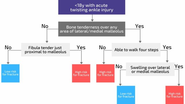 Ако дете може да хода четири корака, али постоји оток преко латералног или медијалног маллеола, онда поново постоји велики ризик од прелома, што би захтевало радиографско испитивање.