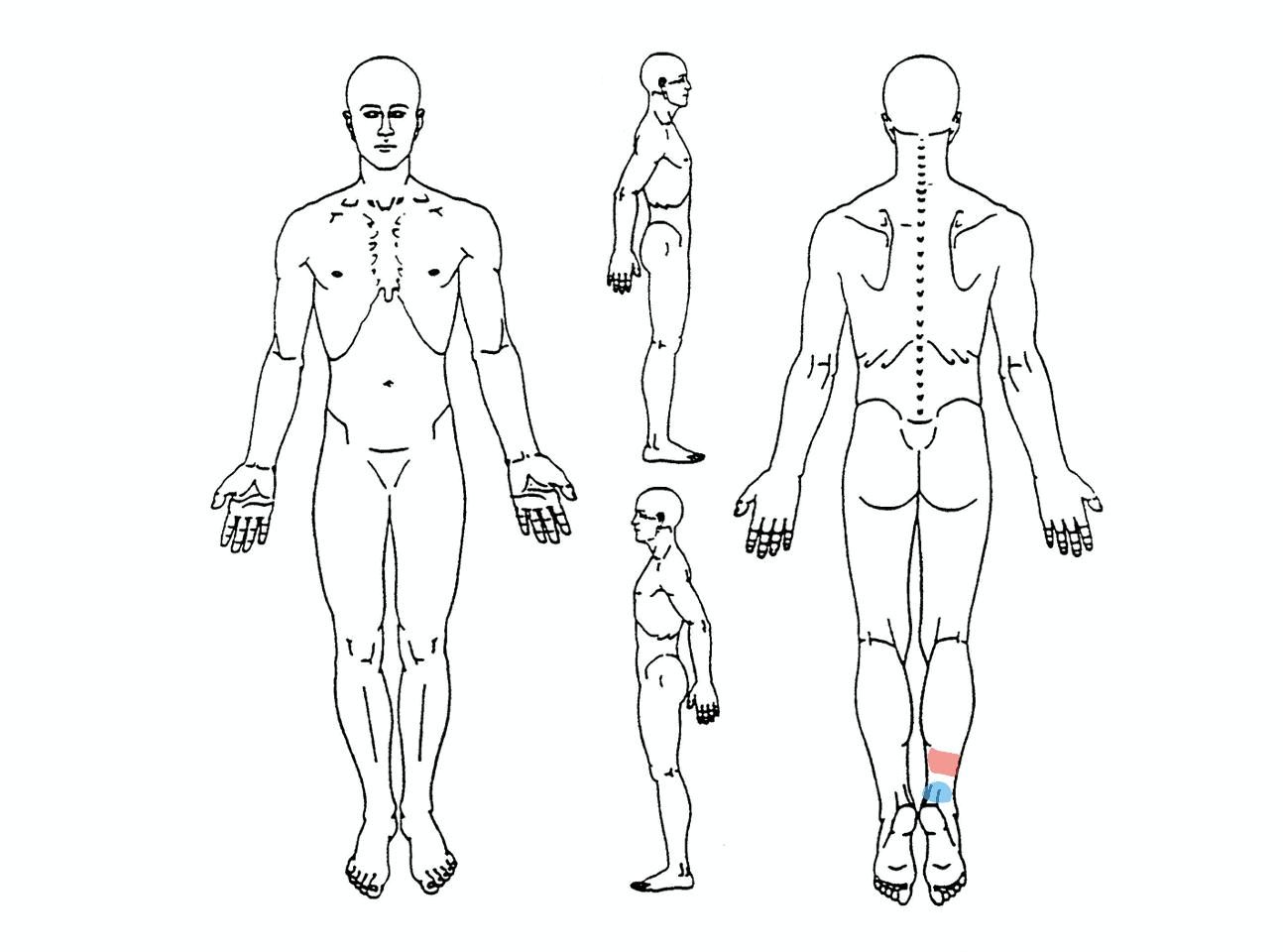 - อาการปวดเมื่อคลำเอ็น (ส่วนกลาง: 2-3 ซม. เหนือจุดแทรกส้นเท้า ที่ตำแหน่งการแทรก: รอยต่อระหว่างกระดูกและเอ็น)