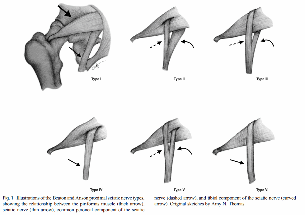 1. การศึกษาโดย Barret et al. (2018) ได้ตรวจข้อสะโพกผู้ใหญ่ 1,039 ข้อด้วย MRI โดยประมาณร้อยละ 20 มีความผิดปกติของเส้นประสาทไซแอติก ซึ่งอาจทำให้เส้นประสาทไซแอติกไวต่อการกดทับของกล้ามเนื้อ piriformis มากขึ้น