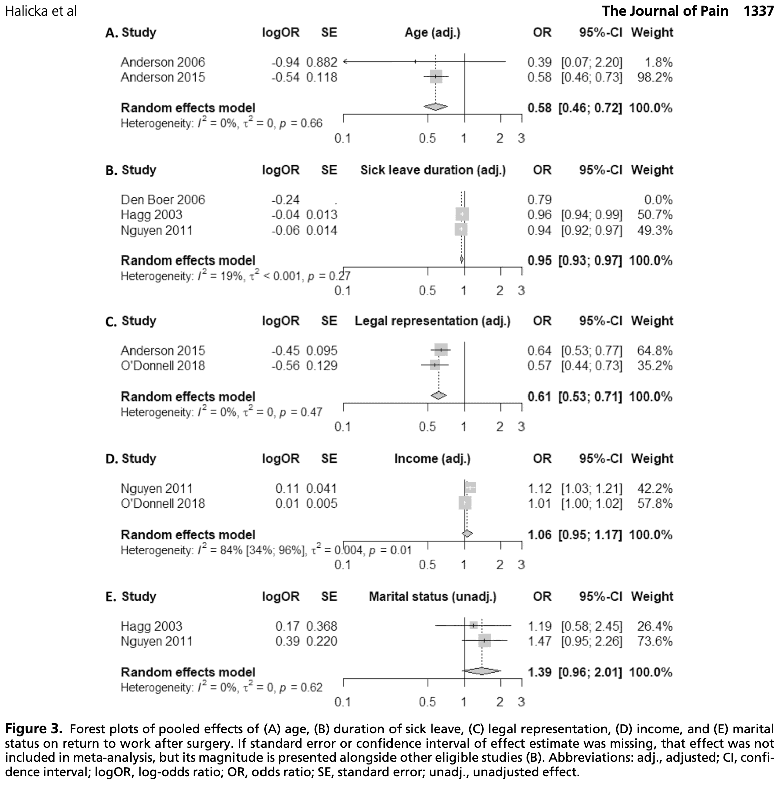 Gelir ve işe dönüş arasında küçük bir ilişki, daha yüksek haftalık ücrete ve hane gelirine sahip katılımcıların ameliyattan sonra işe dönme olasılıklarının daha yüksek olduğu 2 düşük riskli yanlılık çalışmasında bulunmuştur. Ancak, havuzlanmış düzeltilmiş OR anlamlı olmadığından bu etki meta-analiz tarafından desteklenmemiştir. Meta-analiz yüksek heterojenliğe (%84) sahiptir ve bu da anlamlılığın olmamasının bir nedeni olabilir. Bu konunun daha detaylı incelenmesi gerekmektedir.