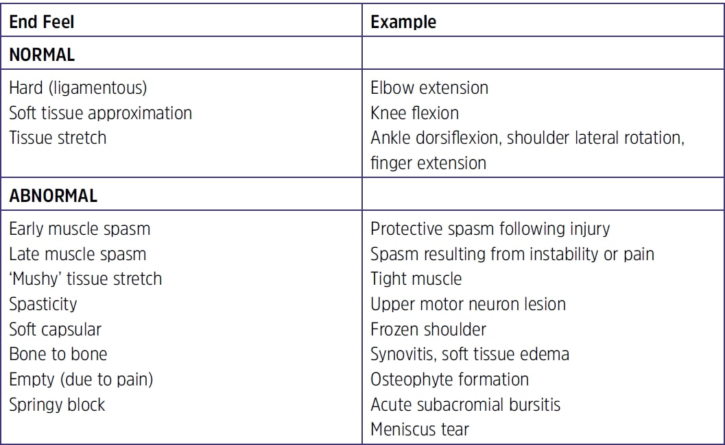 PROM genellikle AROM sırasında sınırlı ROM gözlemlediğinizde yapılır. PROM'un amacı, tam hareket açıklığını neyin sınırladığını belirlemek için eklemin son hissini elde etmektir. Aşağıdaki tabloda "normal" ve "anormal" son his türlerine genel bir bakış gösterilmektedir: