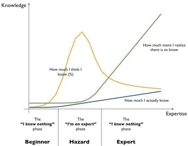 Mới ra trường chưa đầy 2 năm, có lẽ khó tin là tôi lại có cái tôi để viết bài đưa ra lời khuyên cho bất kỳ ai hoặc giáo dục về những kiến thức lâm sàng. Có lẽ là do sự ngây thơ của tôi hoặc chỉ là hiện thân của hình ảnh minh họa tuyệt vời mô tả mối quan hệ giữa lượng kiến thức bạn nghĩ mình biết và lượng kiến thức thực tế bạn biết.
