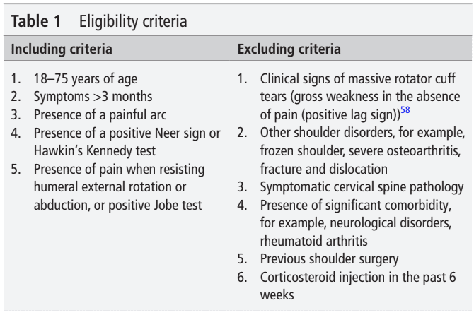 本研究采用随机对照设计,纳入了年龄在 18-75 岁之间的 RCRSP 成年参与者。 他们的肩部症状持续了 3 个多月,并伴有疼痛的弧线。 他们接受了尼尔征、霍金肯尼迪试验、抗阻肩关节外旋和外展以及乔布试验的检查。 至少需要 3 次阳性检测才能纳入 RCRSP。 这个群组是根据 Michener 等人 2009 年的研究成果改编而成的,旨在将本研究中的受试者纳入其中。