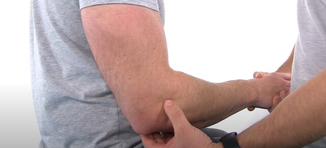 进行这项测试时,治疗师支撑着患者的手臂,使其肘部处于屈曲状态。 检查员触摸桡骨头的前外侧。 然后将拇指滑过桡骨头,同时前臂被动上举。 肌肉通过与桡骨头保持紧密接触而被推开。